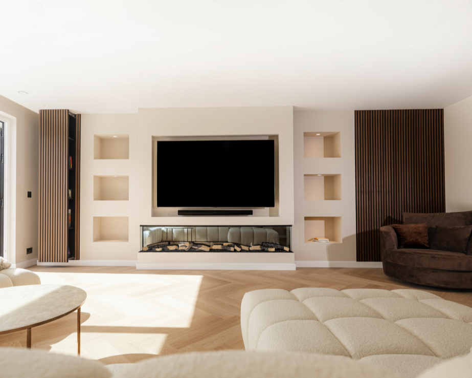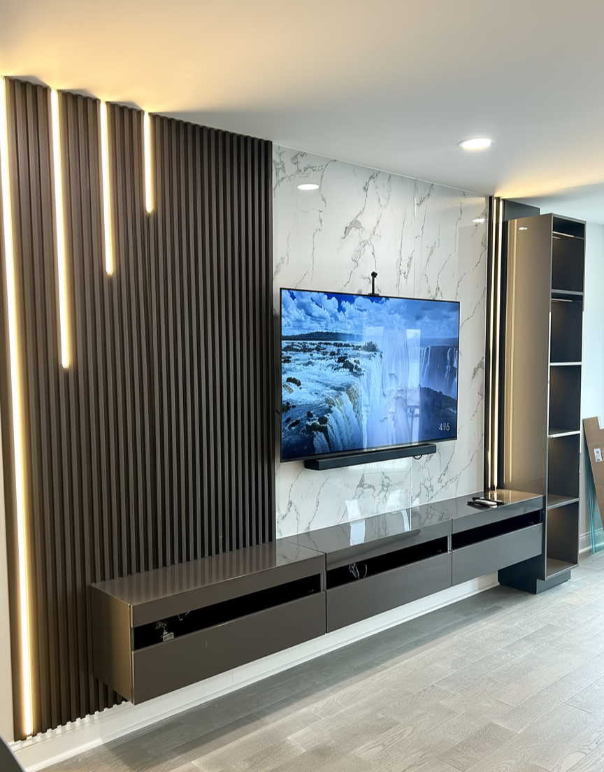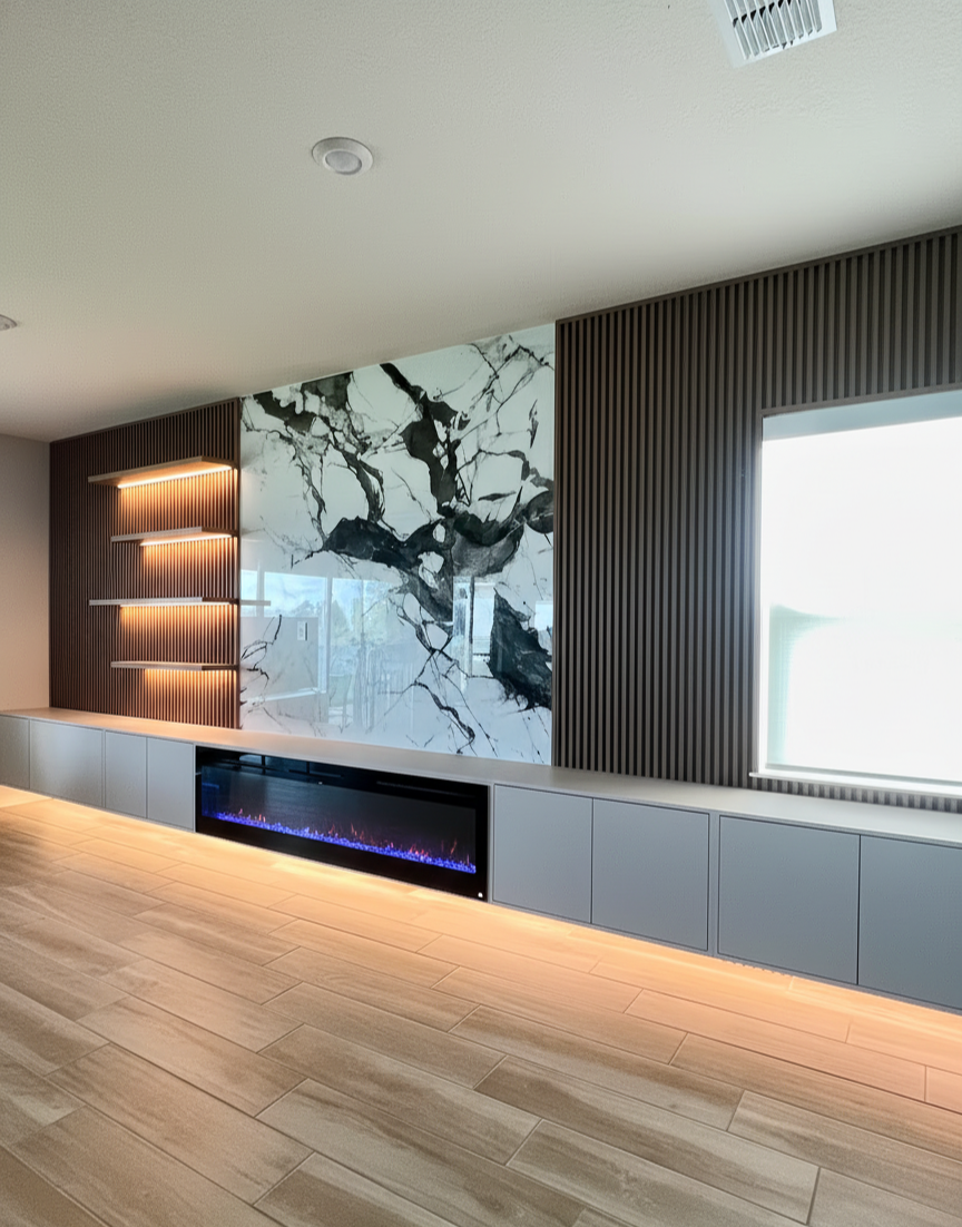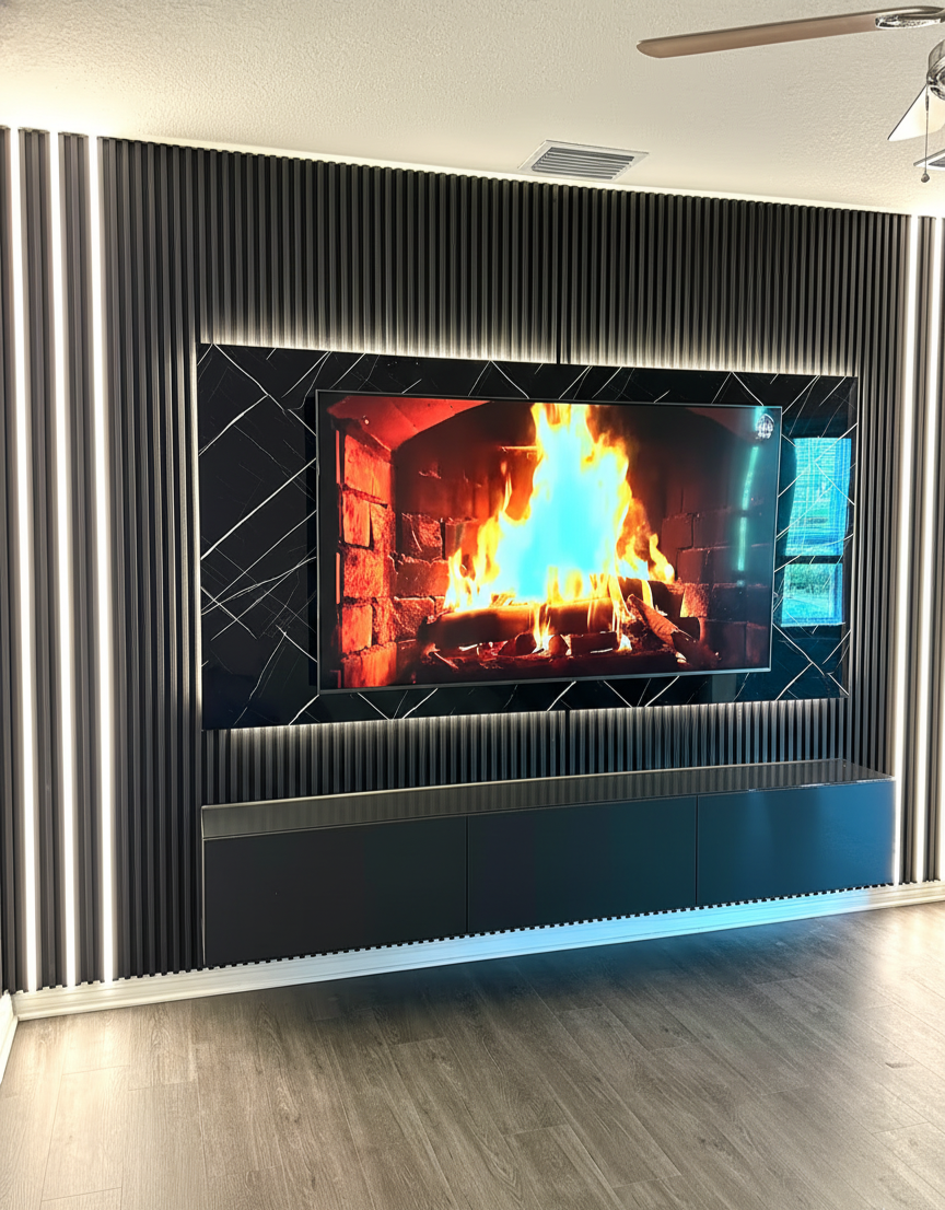 A minimal TV wall was transformed into a sophisticated centerpiece featuring dark wood slat panels, integrated shelving, and hidden storage. The design includes a built-in electric fireplace and LED accents, creating a warm, modern atmosphere with seamless functionality.