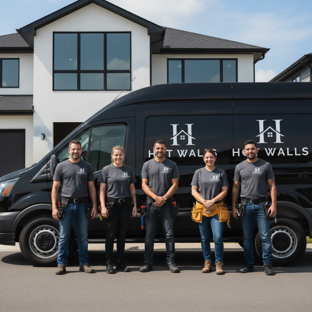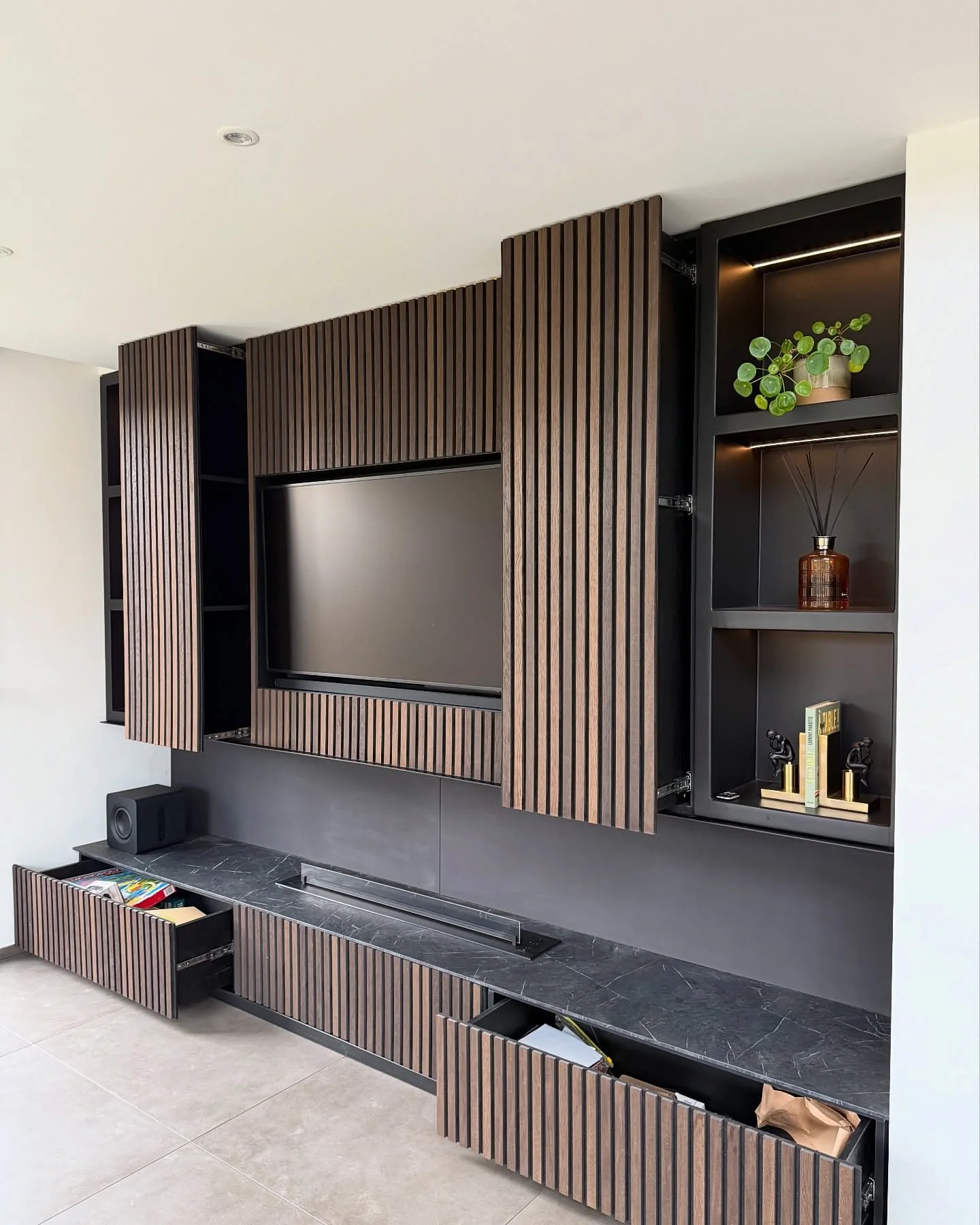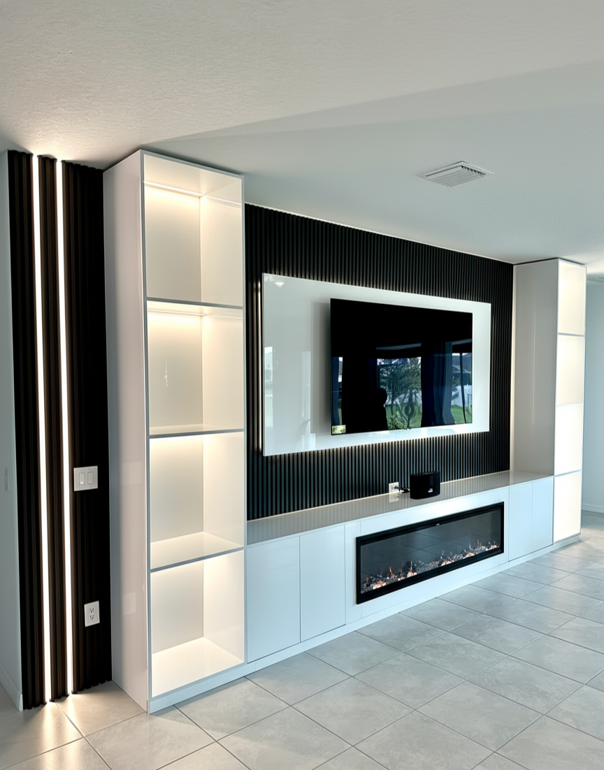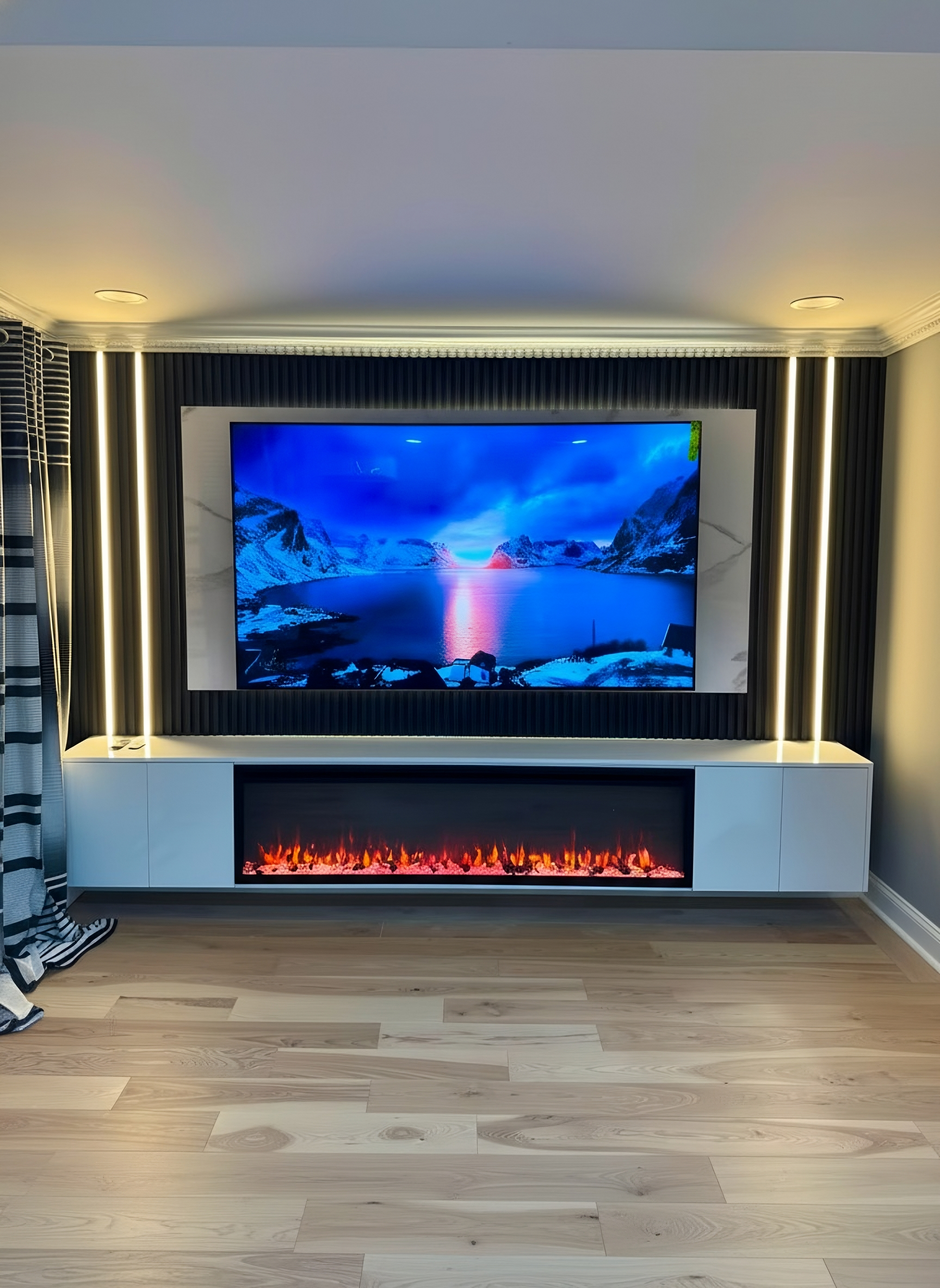 A minimal TV wall was transformed into a sophisticated centerpiece featuring dark wood slat panels, integrated shelving, and hidden storage. The design includes a built-in electric fireplace and LED accents, creating a warm, modern atmosphere with seamless functionality.