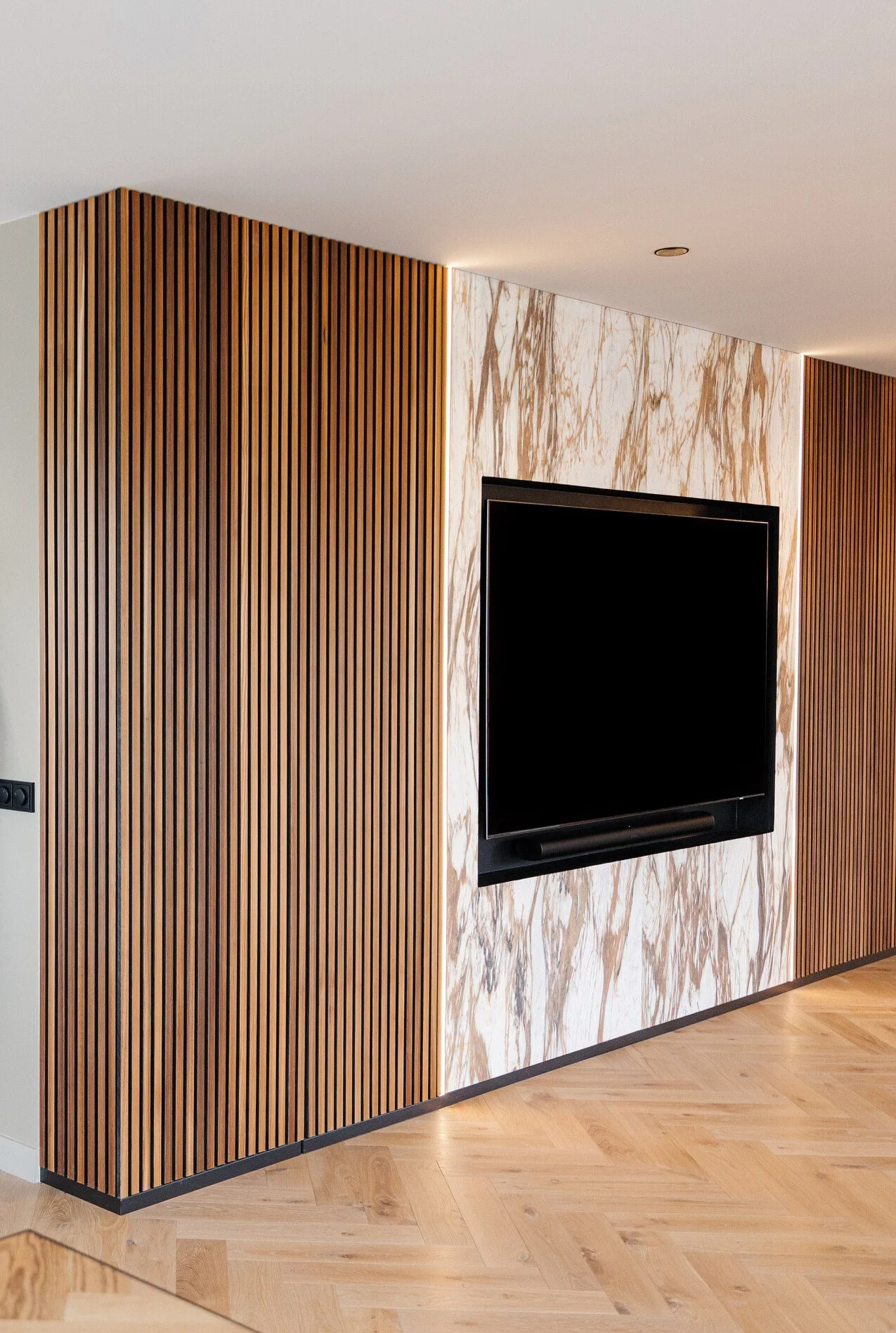 A plain office wall was transformed into a stunning media feature with custom slat panels and marble finishes