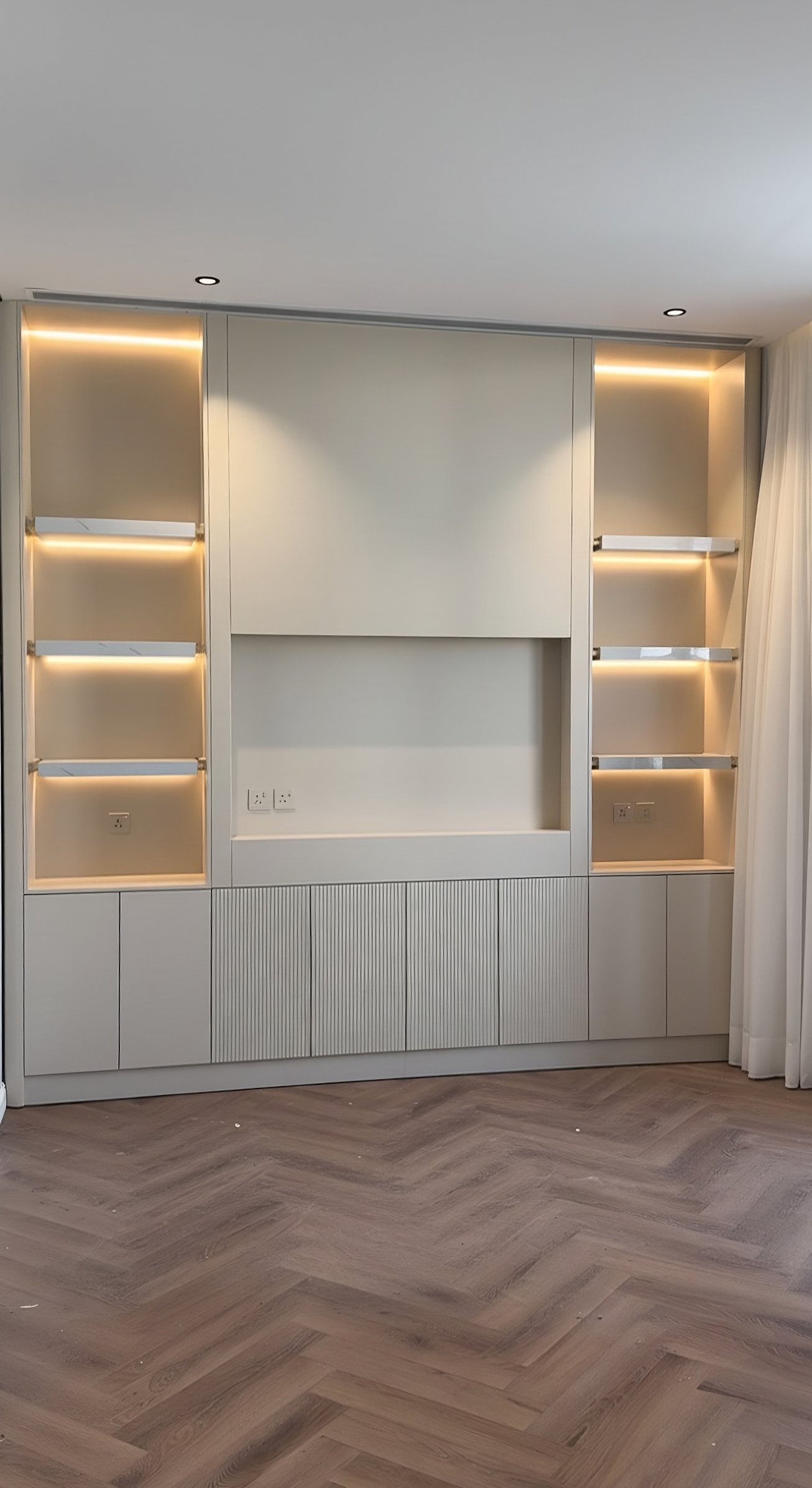 A bright and elegant built-in unit featuring LED-lit shelving and hidden storage. The clean lines, soft beige finish, and integrated lighting create a warm, modern centerpiece — perfect for both display and function.